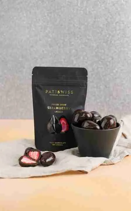 شوكولاتة داكنة محشوة بالفراولة المجففة بدون سكر خاصة لجماعة الحمية الغدائية و اللياقة البدنية